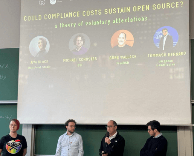 Towards the end of the day, it was time for Æva Black to present an update on the Working Group they’re leading on Voluntary Security Attestations, and how they can play a role in open source sustainability. After the update, Æva welcomed Michael Schuster, me, and Tommaso Bernabo to join her for a panel discussion. I was very impressed with the expert understanding of open source and clear commitment to preserving what makes it special that both Tommaso and Michael demonstrated.
