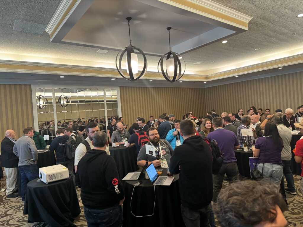 At the end of Monday, Kate, Abby, and Nathan stationed their booth at the NANOG Peering Forum, with Abby giving out her business cards.